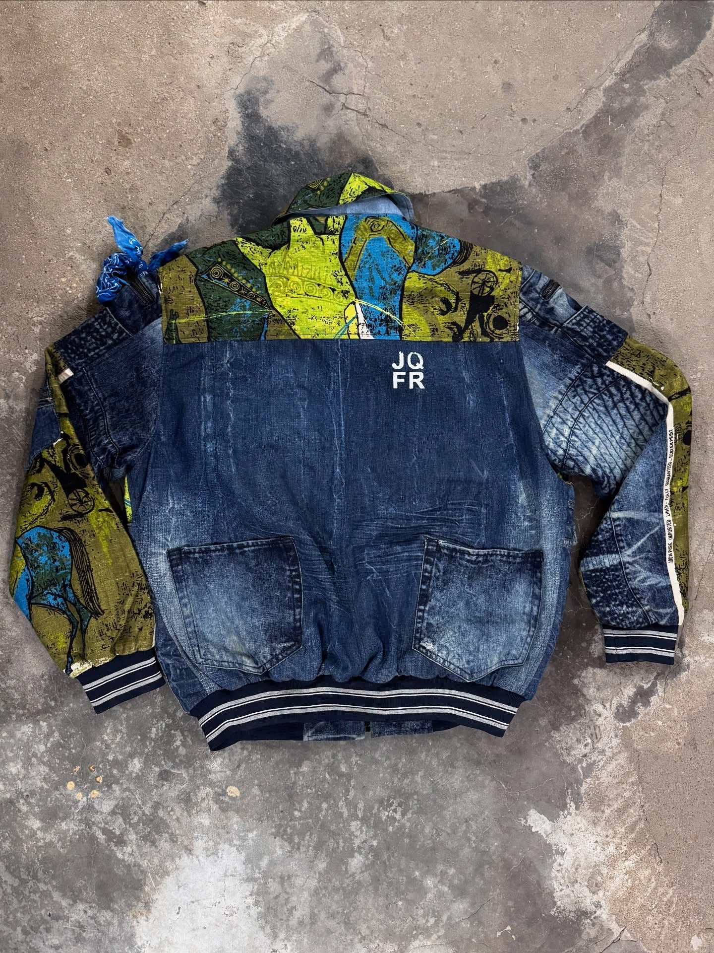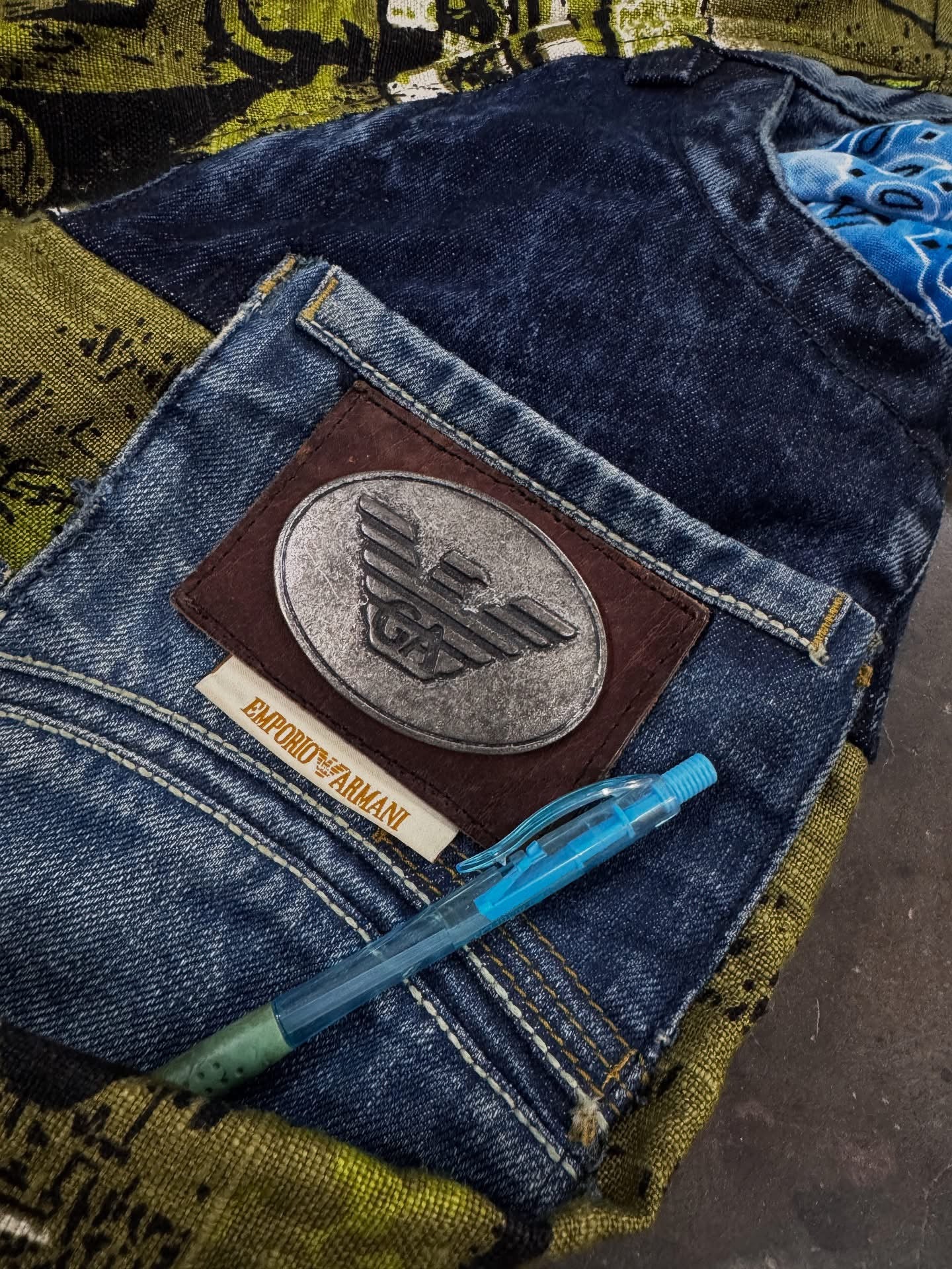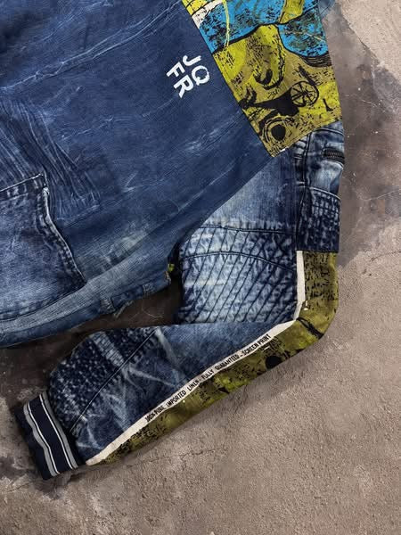 Handcrafted denim jacket inspired by Moschino’s true artistic spirit, creatively converted from Moschino pants into a statement jacket, featuring bold panels, textured finishes, and detailed stitching every detail tells a story.