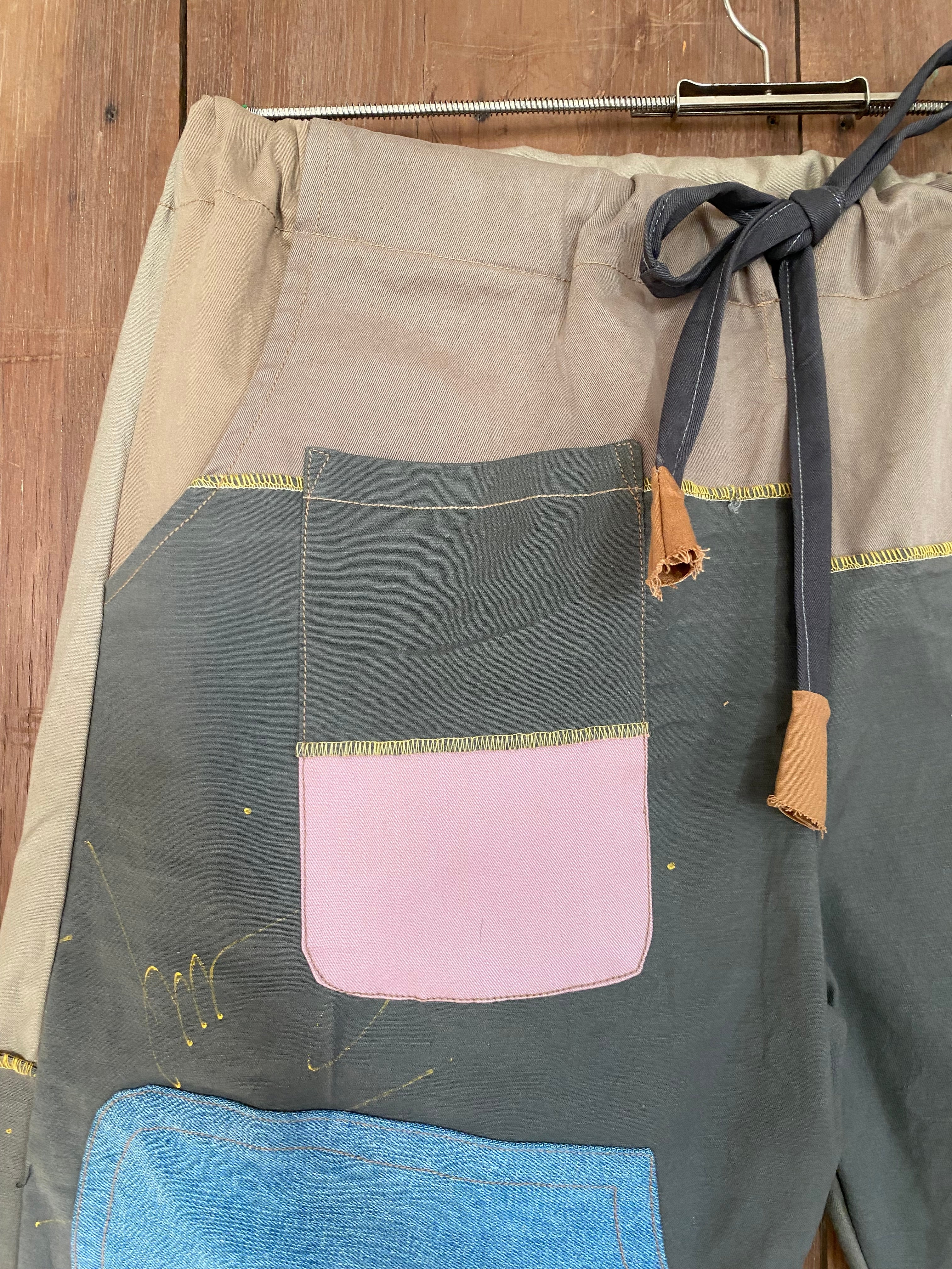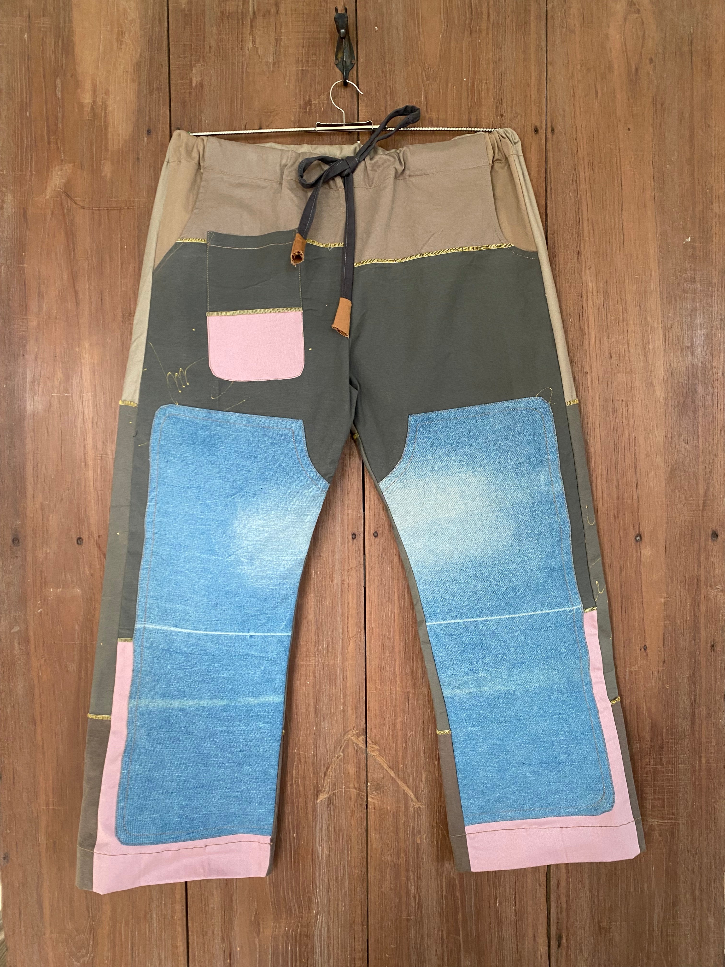 Reart salvage denim bottom featuring patchwork panels, contrast fabrics, relaxed fit, drawstring waist, and unique handcrafted detailing for modern streetwear style.