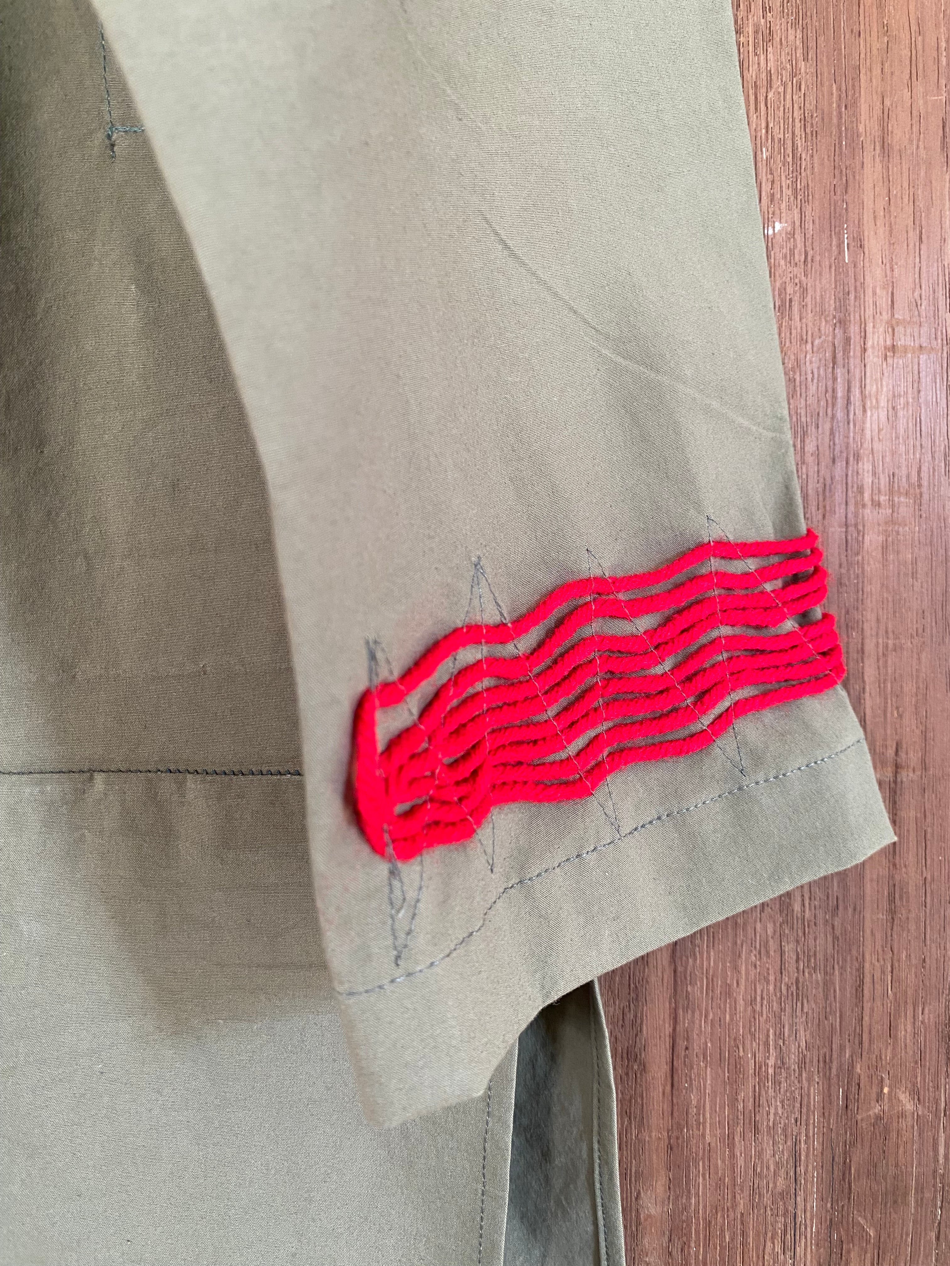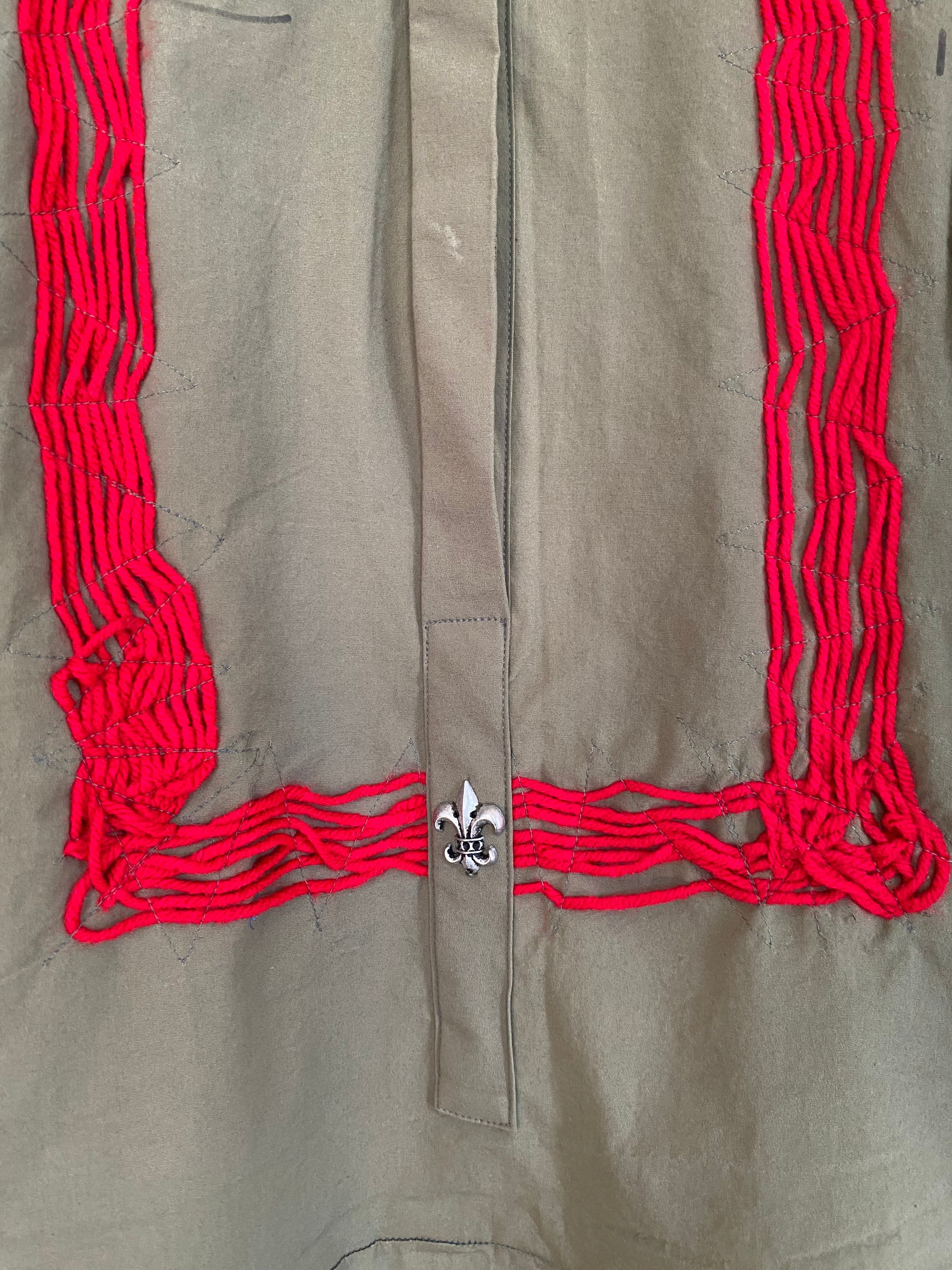 Olive green cotton kurta featuring bold red handcrafted cord detailing, mandarin collar, relaxed silhouette, and statement front embellishment.