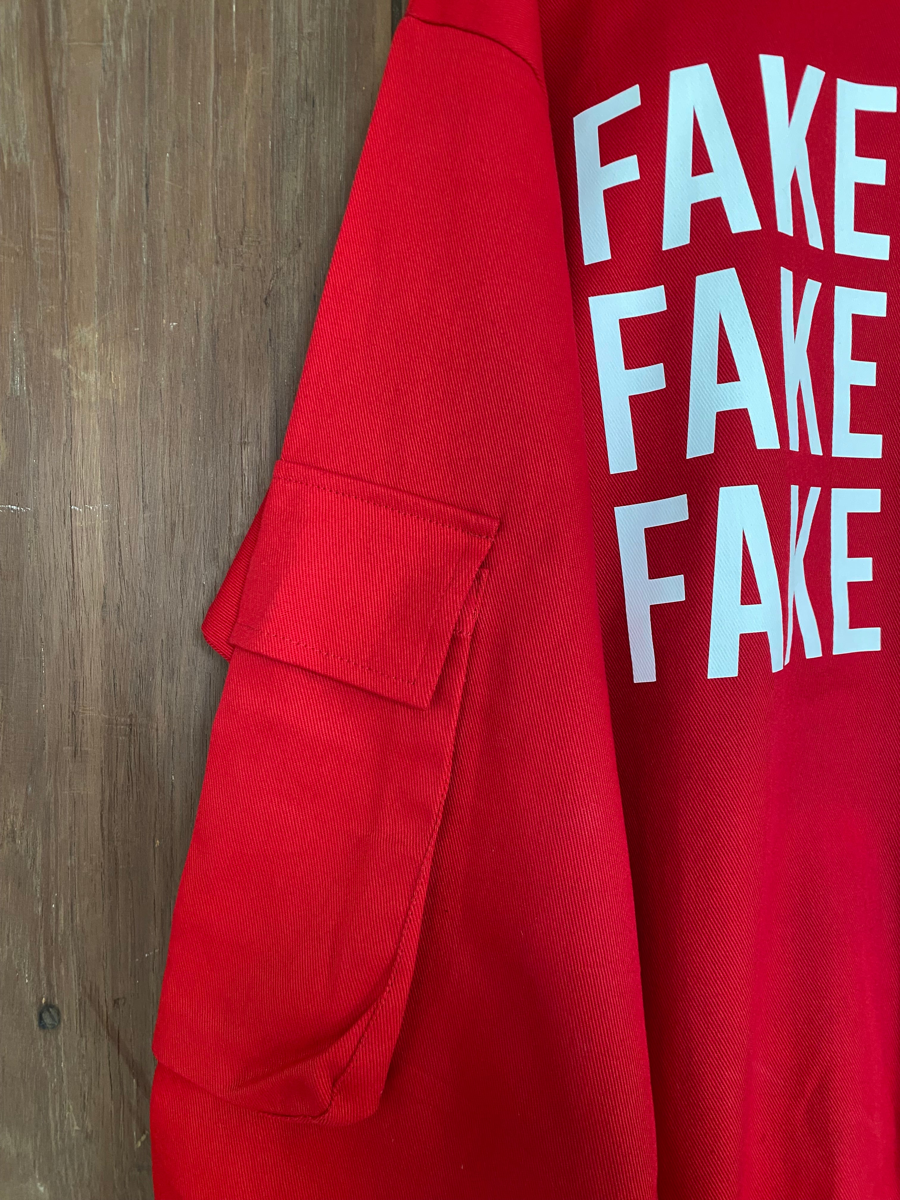A striking red oversized sweatshirt featuring cargo sleeve pockets and bold typography. Perfect for confident street style and everyday winter layering.