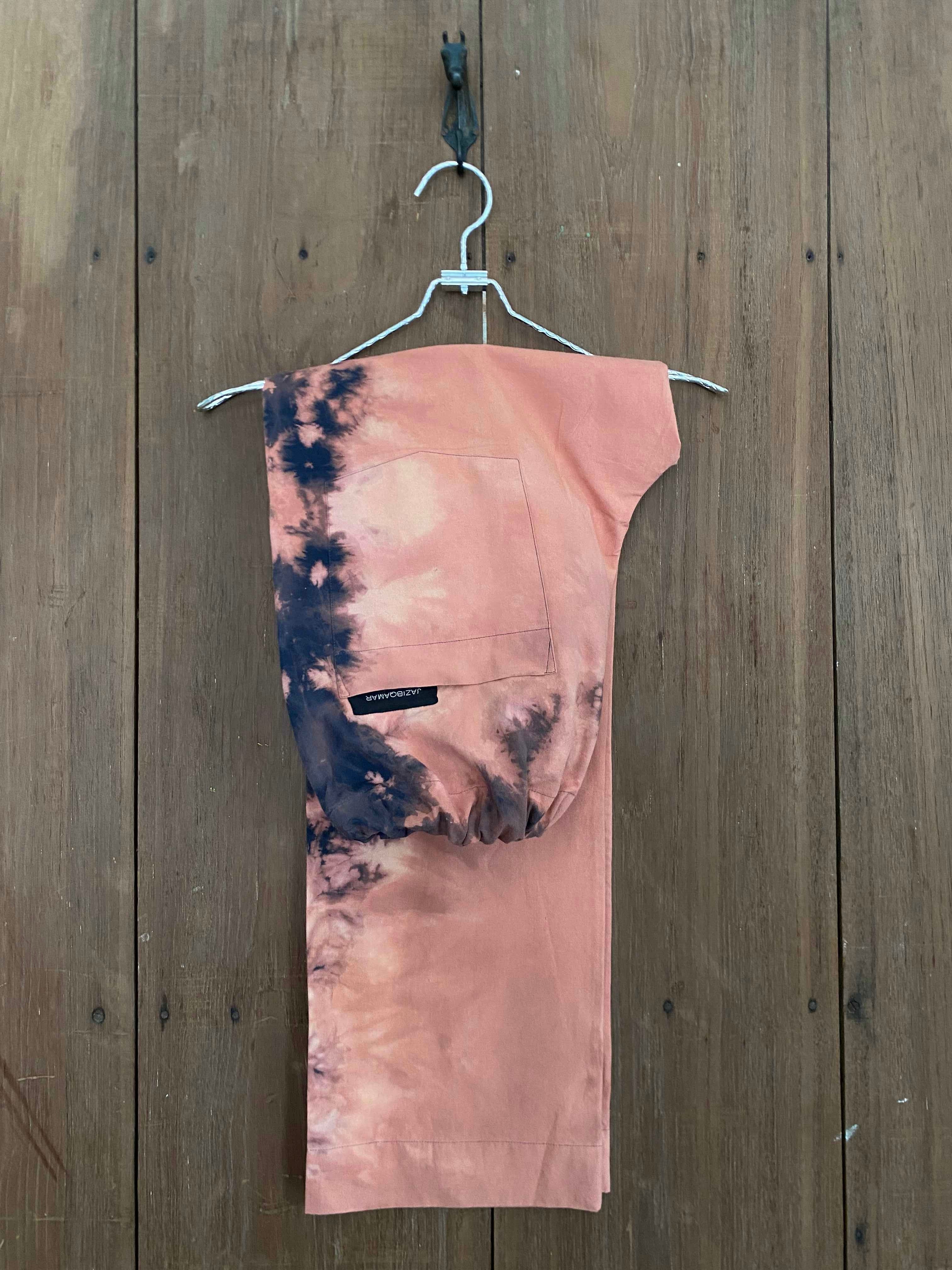 Hand-dyed splash trousers with a relaxed, universal fit. Features an adjustable drawstring waist and five functional pockets for style and comfort.