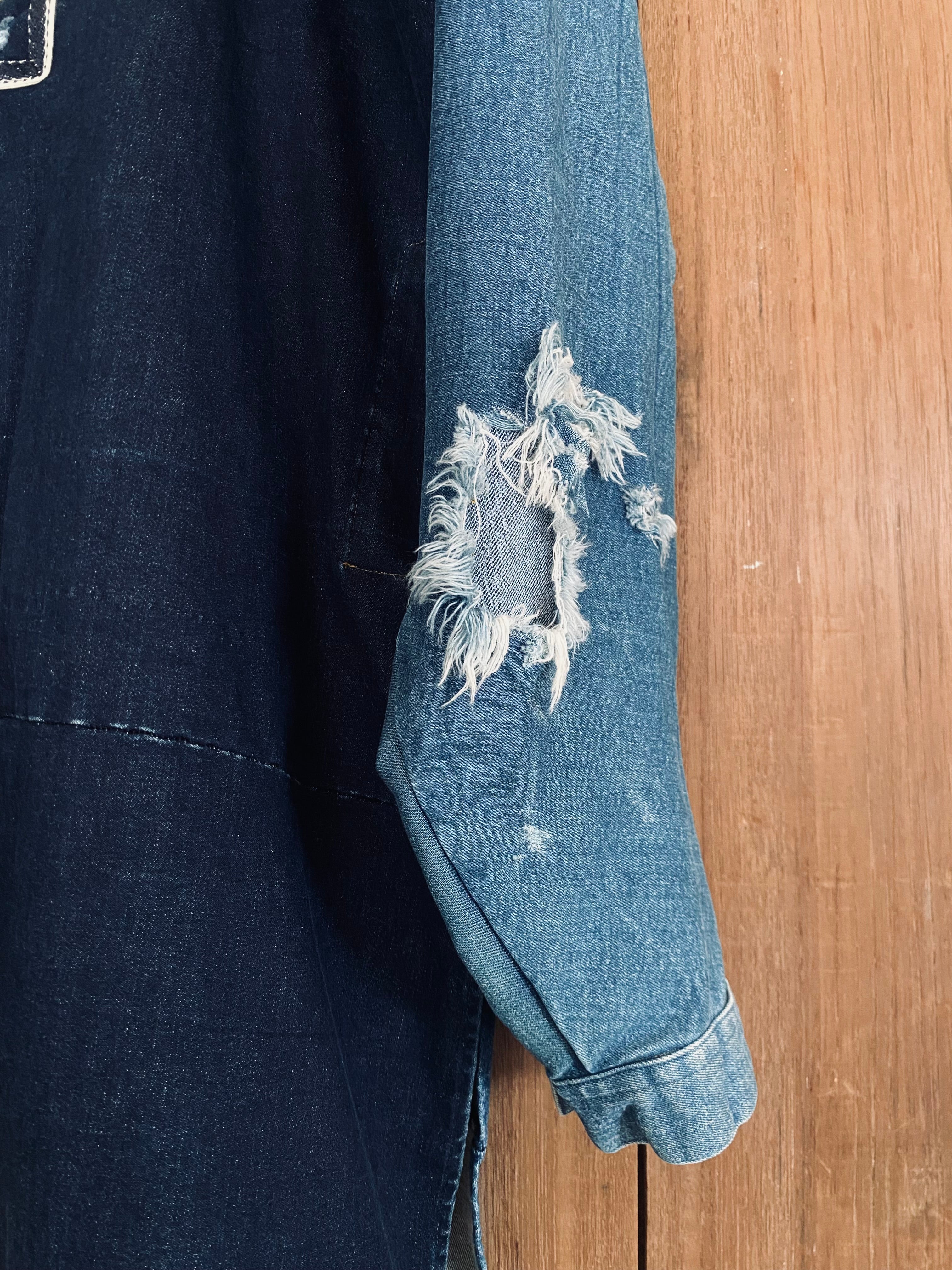 Handcrafted denim kurta with stitch details, contrast sleeves, and raw edges—bold fusion of tradition and modern rebellious style.