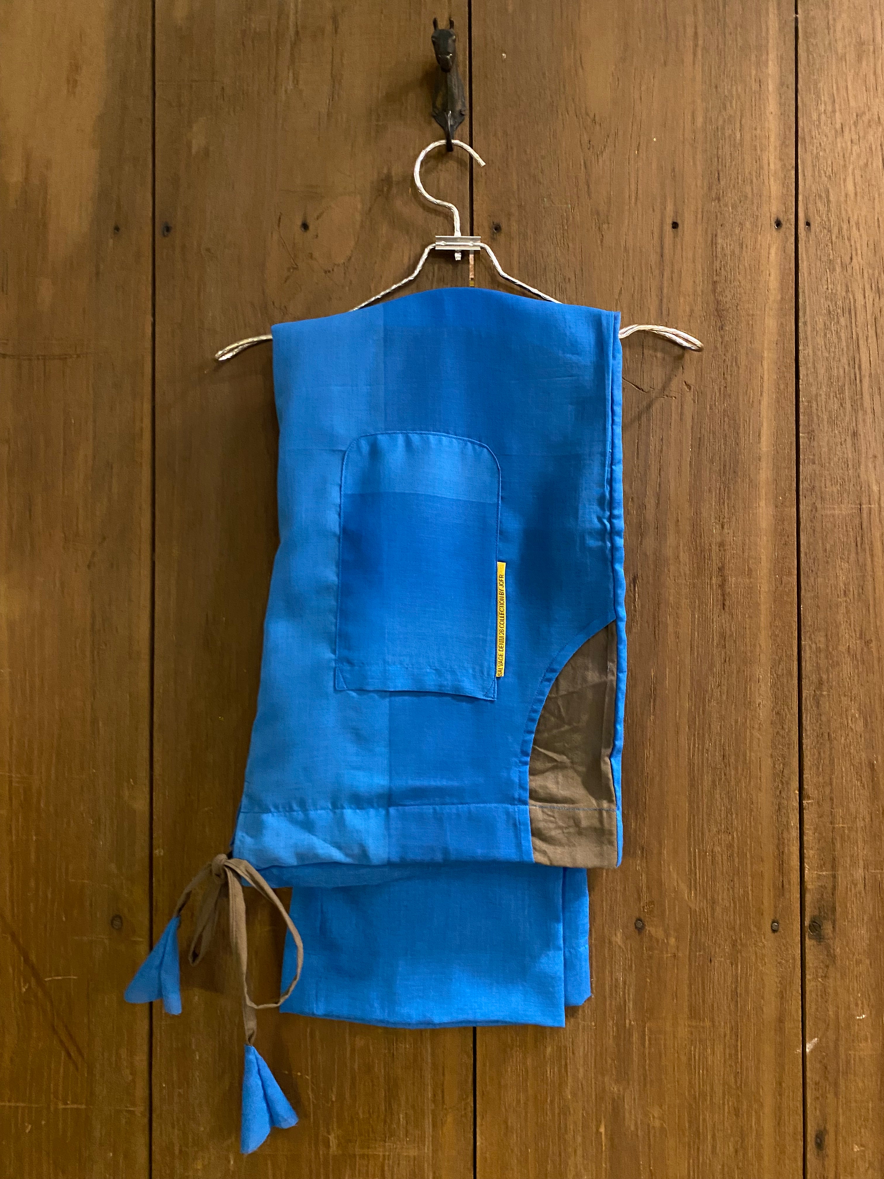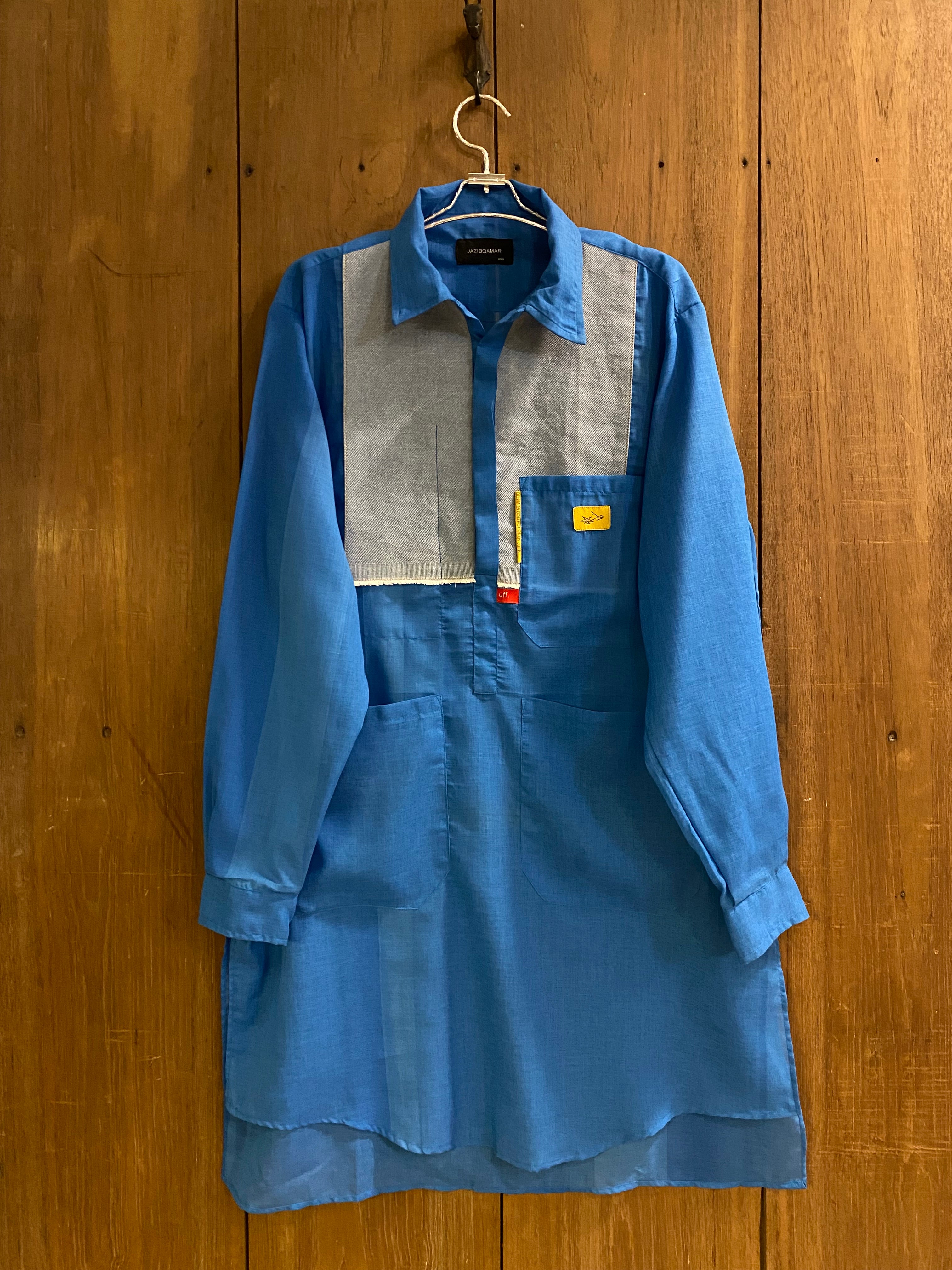 Sky blue lightweight kurta trouser set with modern panel detailing, breathable fabric, relaxed fit, clean aesthetic, street-inspired, perfect for effortless everyday style.