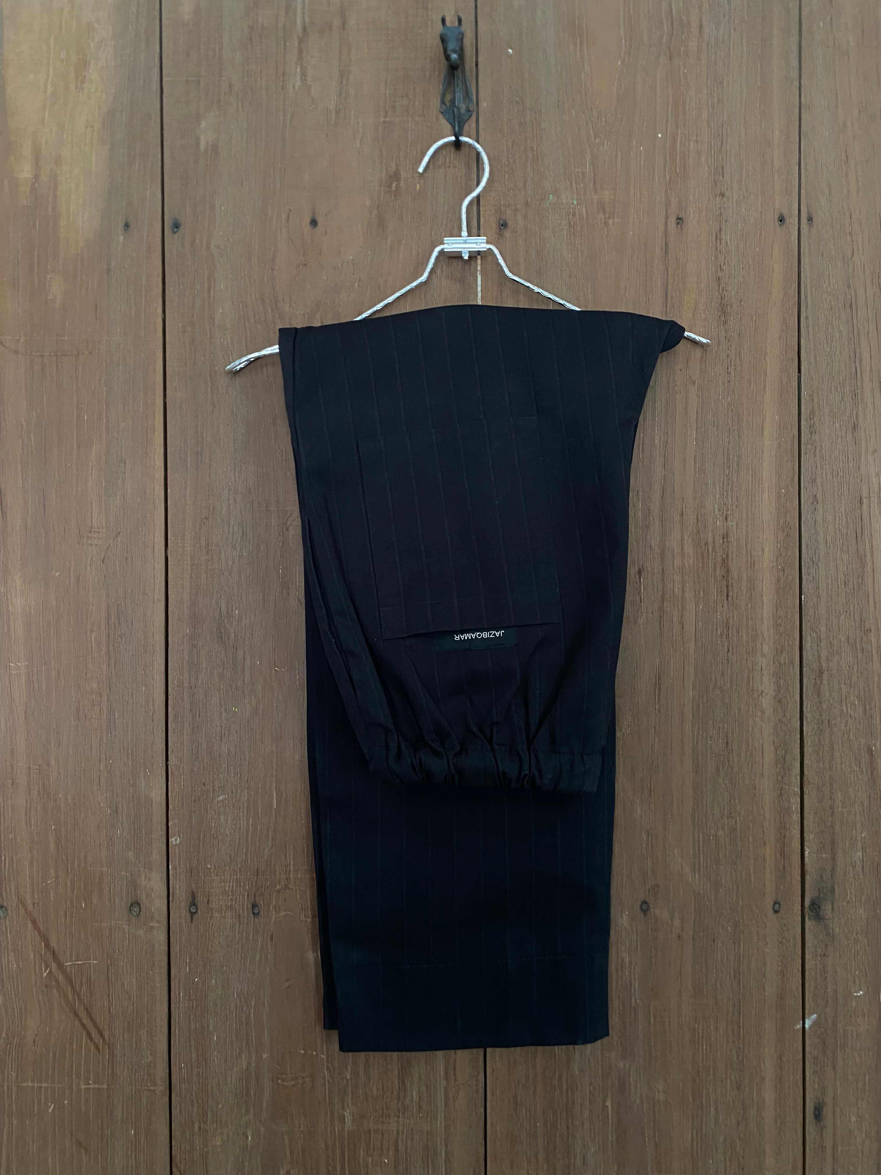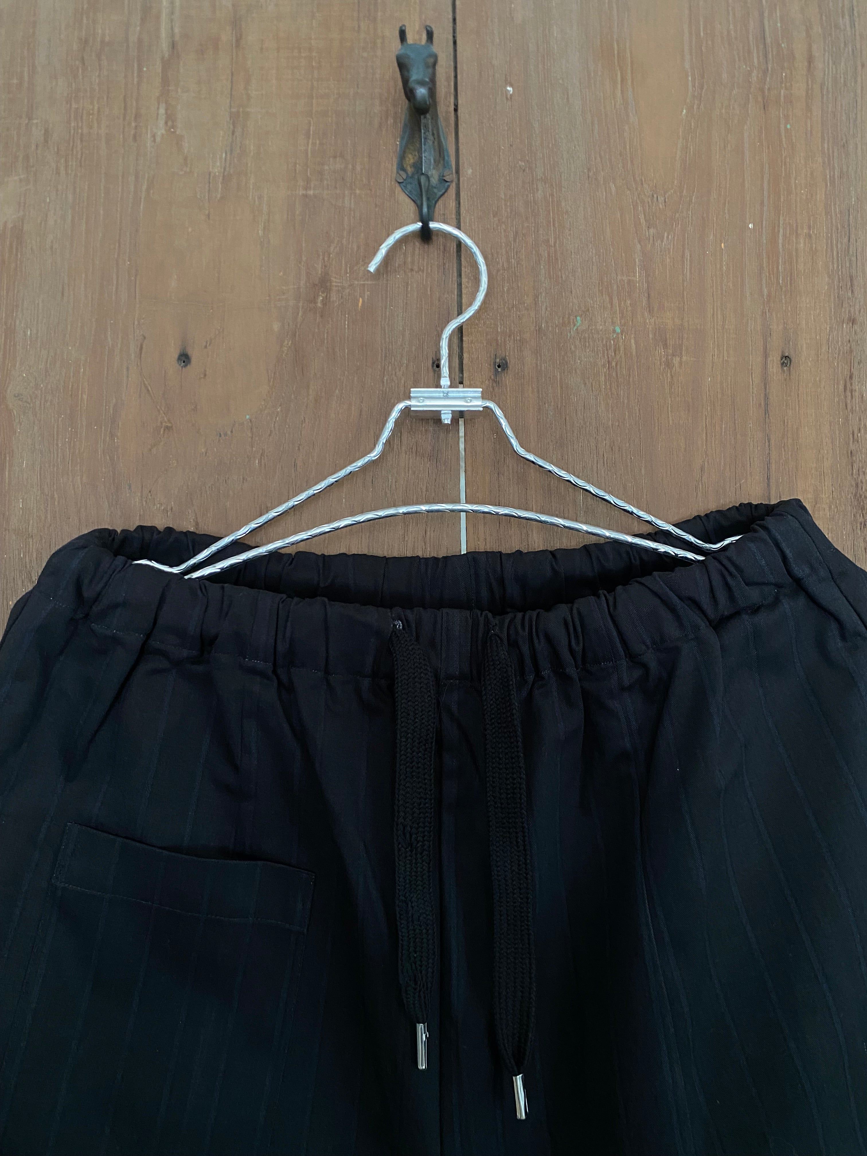 Loose-fit black bottom crafted from soft fabric, featuring subtle pinstripes, drawstring waist, and relaxed silhouette for effortless everyday comfort.